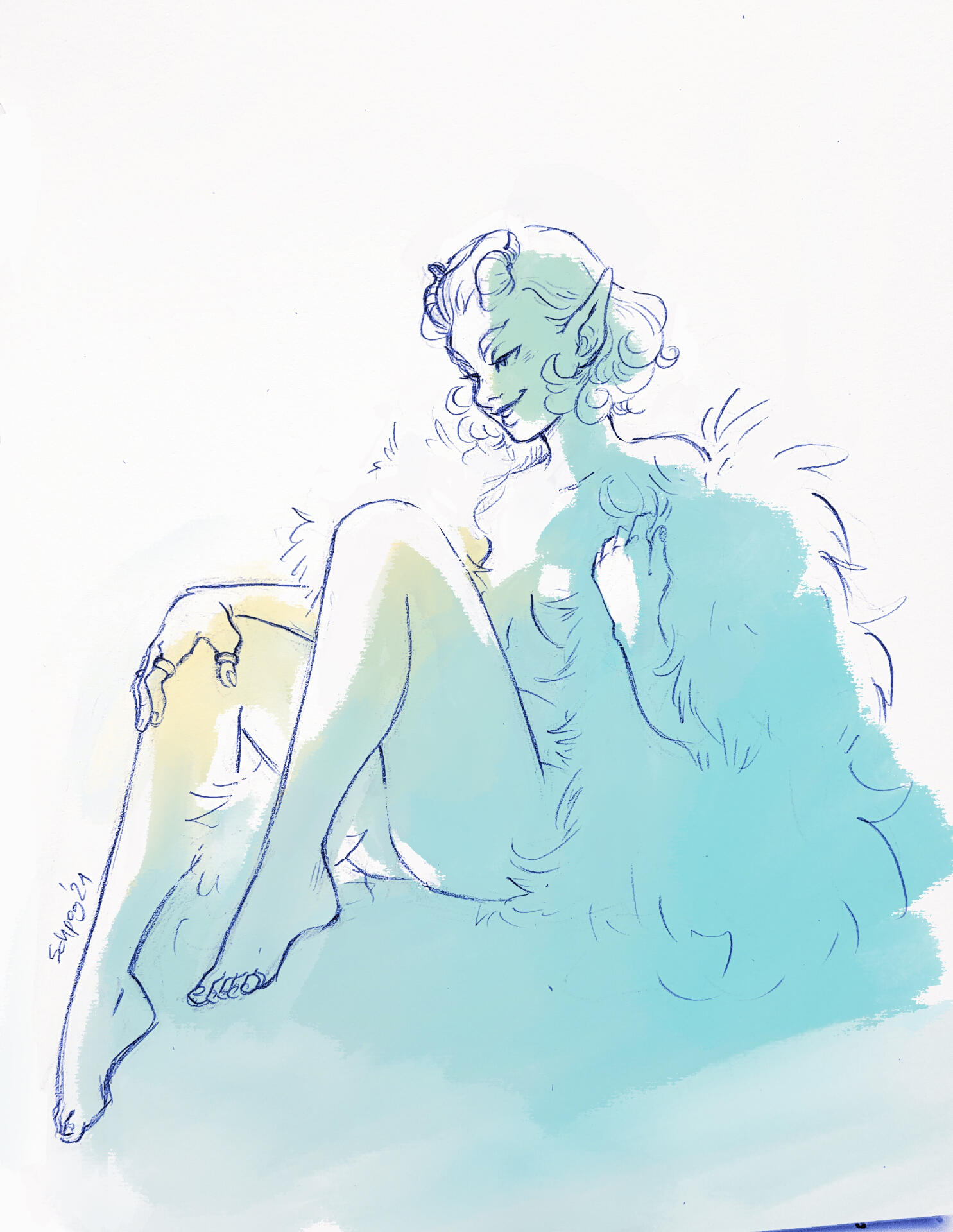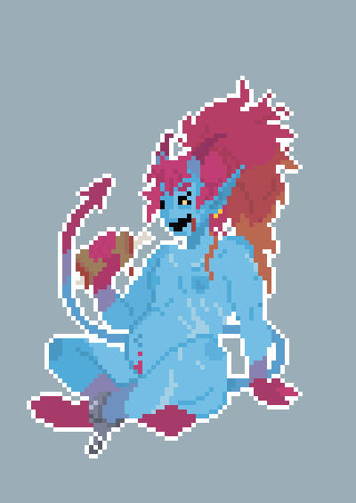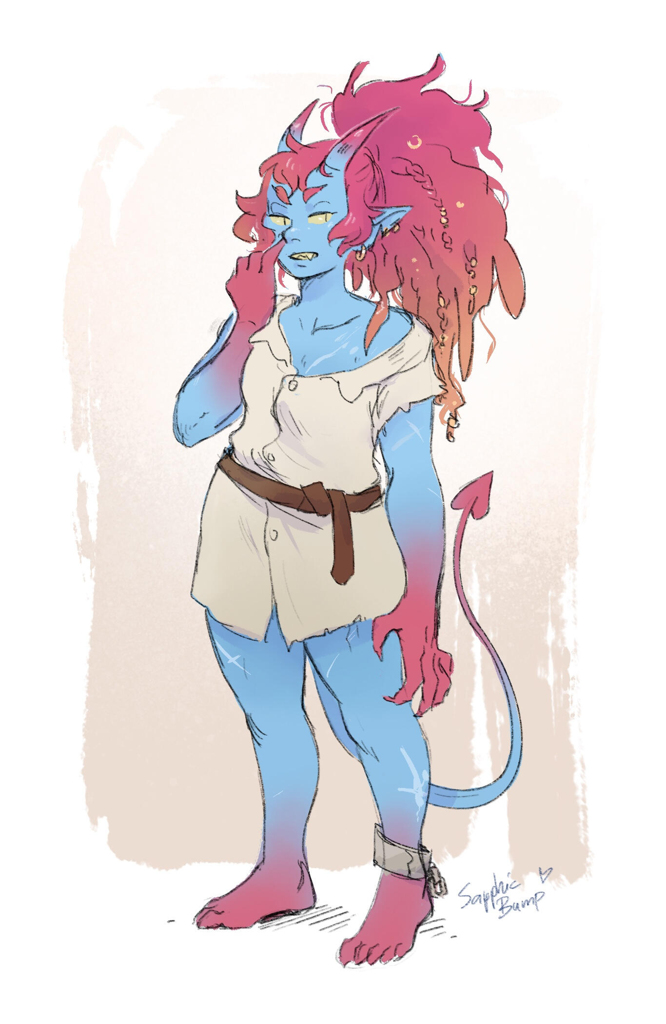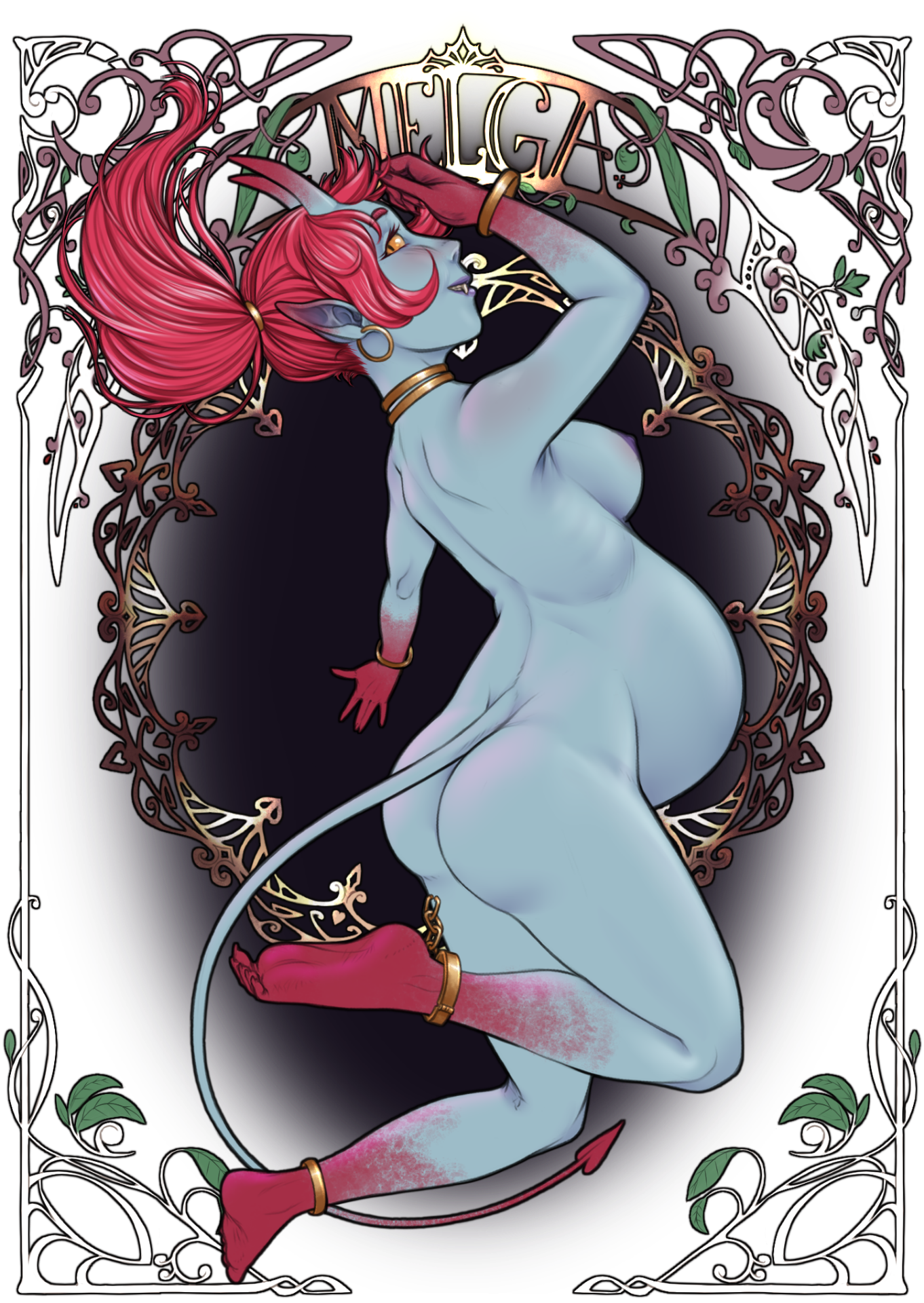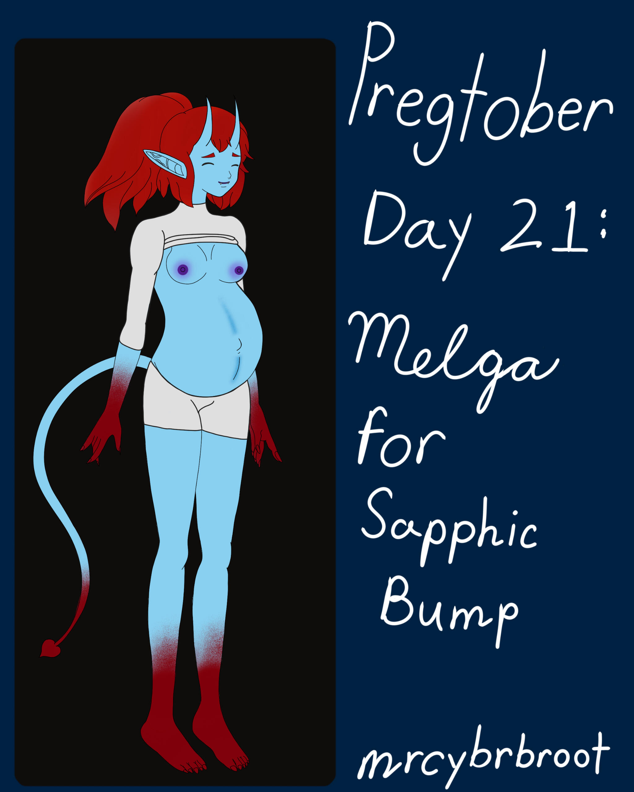 Melga is the first and most favorite character I created when I decided to make the SapphicBump Twitter and Patreon. Despite being one of the more civilized, blue succubus, she is a rather feral. But also sometimes bubbly demon, especially around women. She doesn't talk much. Don't be fooled, she has killed many men after using them for offspring.In the rare cases she enters civilized cities she wears a huge oversized coat. She always carries a bag with said coat with her, including some other little treaures.Loves: