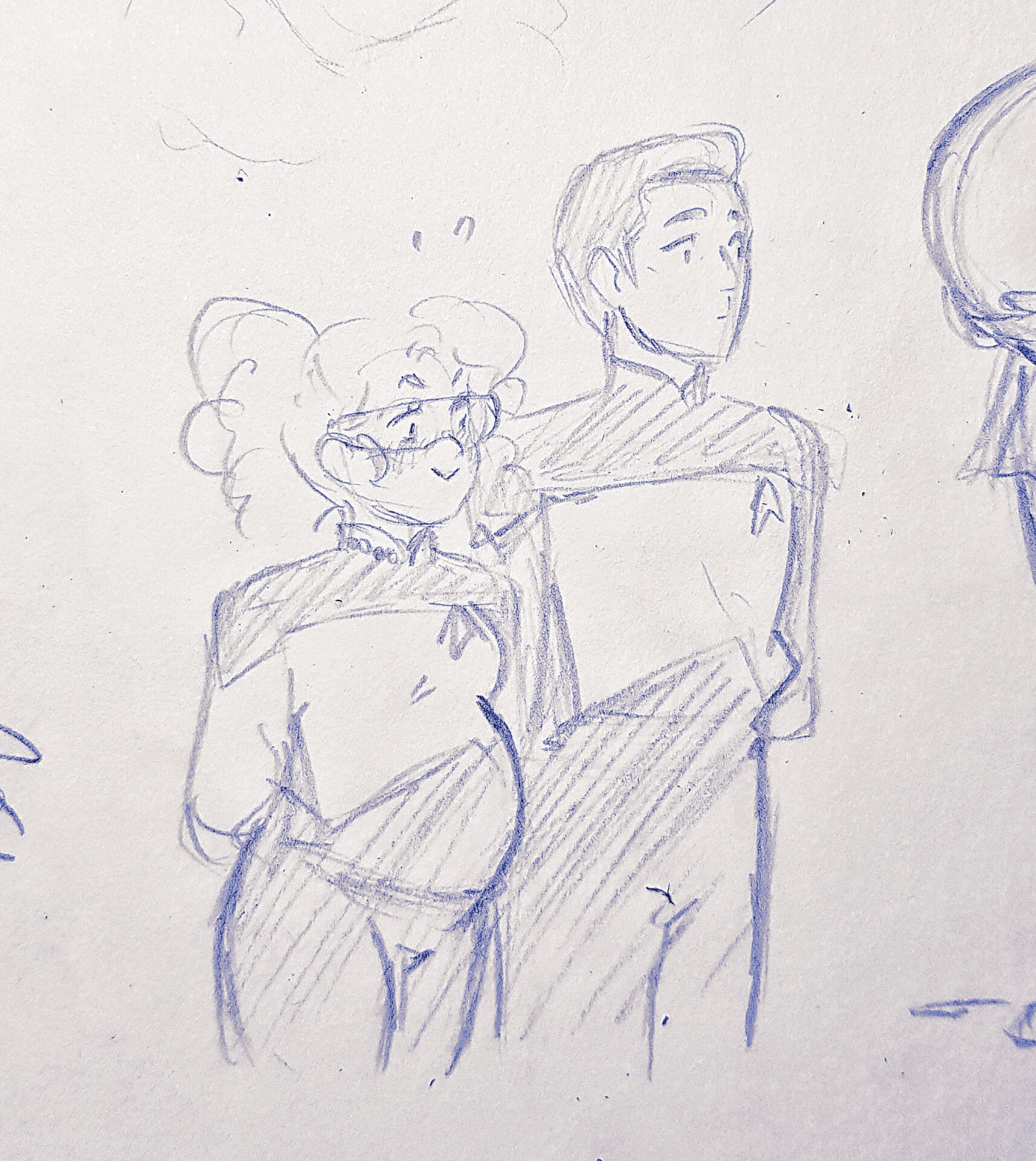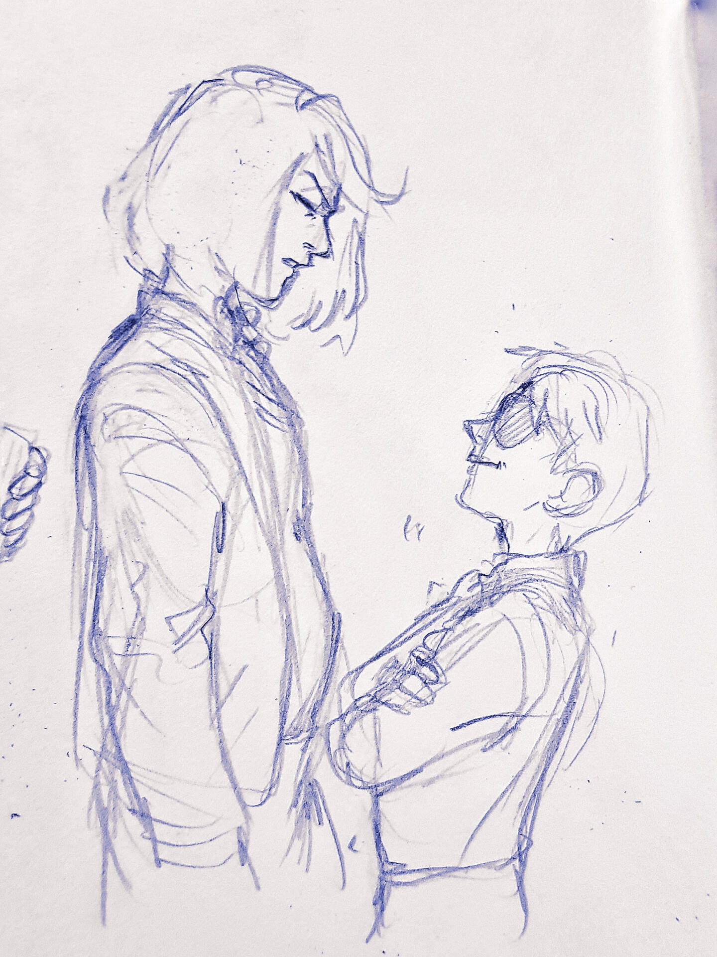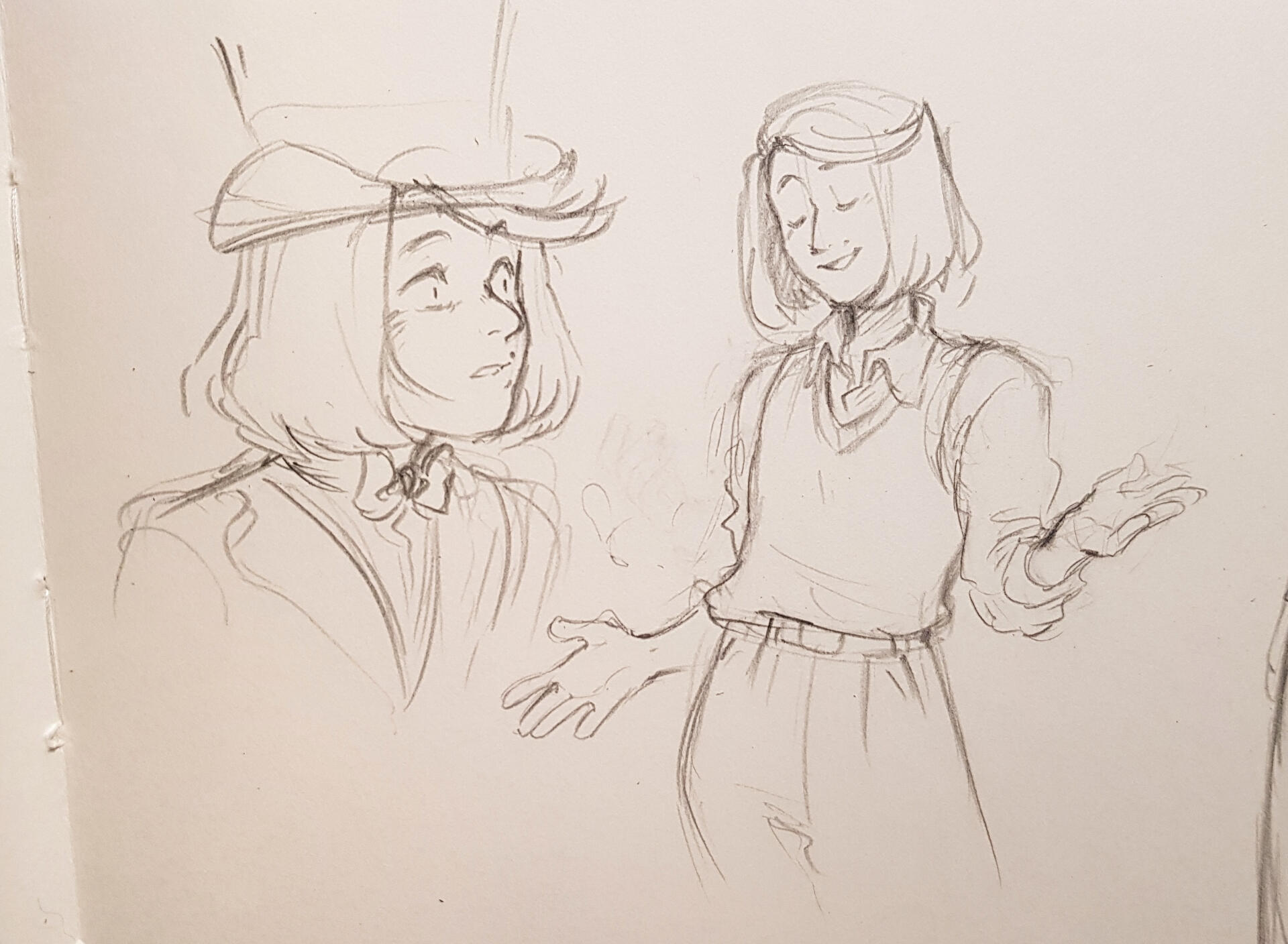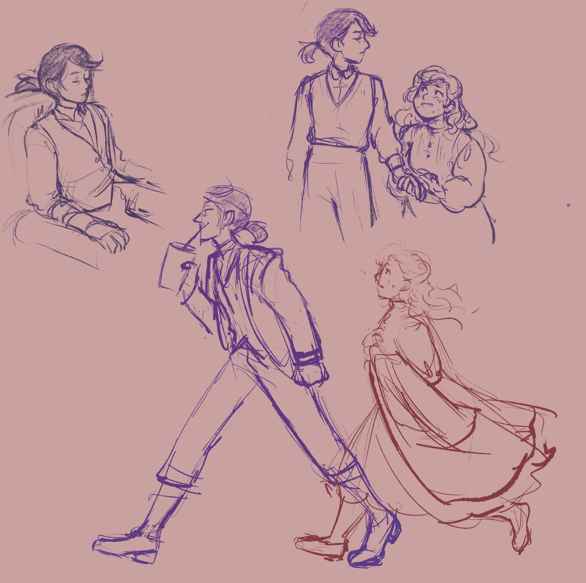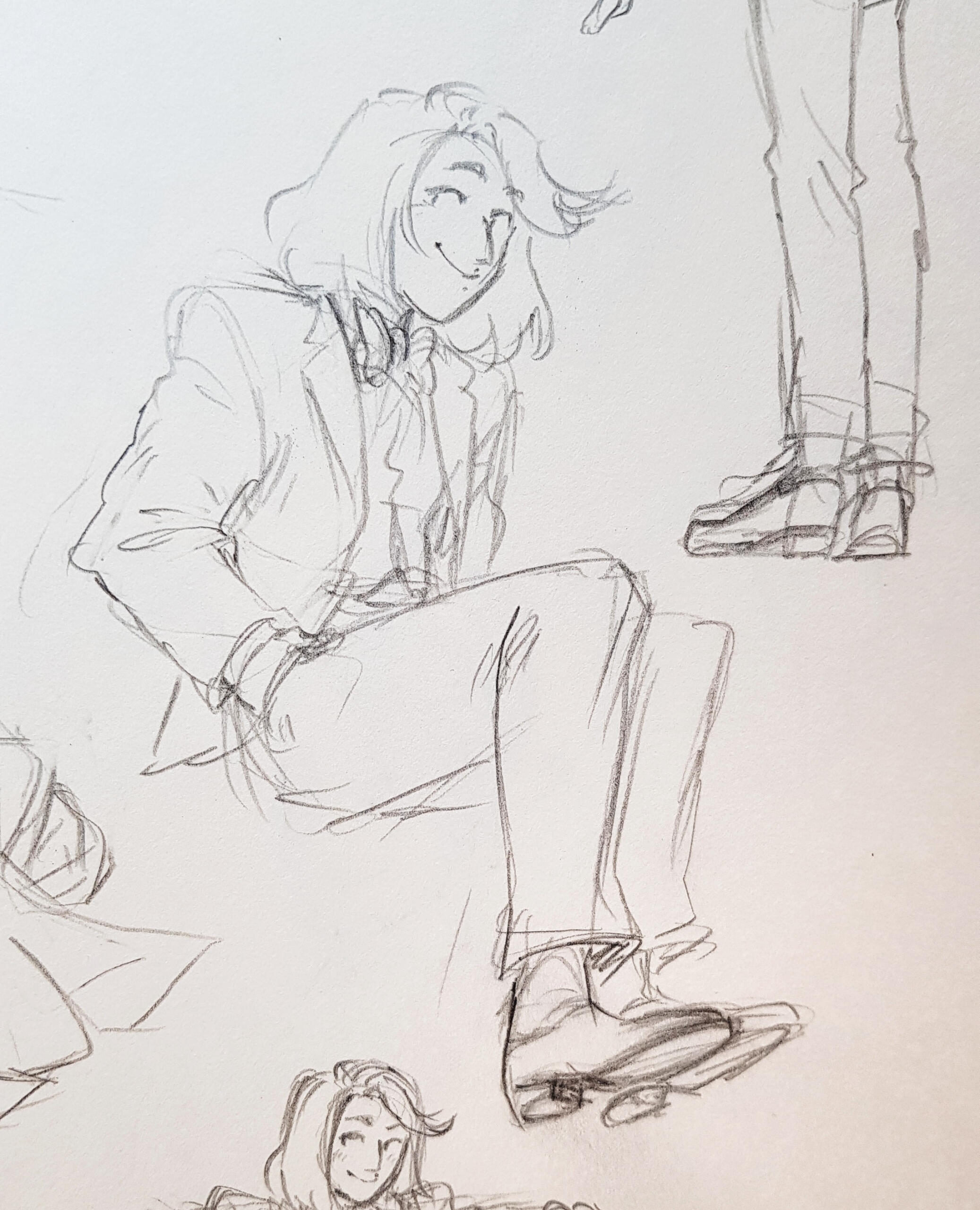 Best value and my favorite commission type! It's like a sketch surprise box. This is like AS x 5, but instead of 375€ you only pay 195€! Great choice if you prefer character, dynamics and interaction! You get 5 single character instances of one or different characters. They can interact, if you want. You can book extra instances (for example: 3 sketches of 2 people interacting would be 6 instances, one extra instance.)You could ask for specific scenes / poses, but I really like when you allow your character to inspire me!