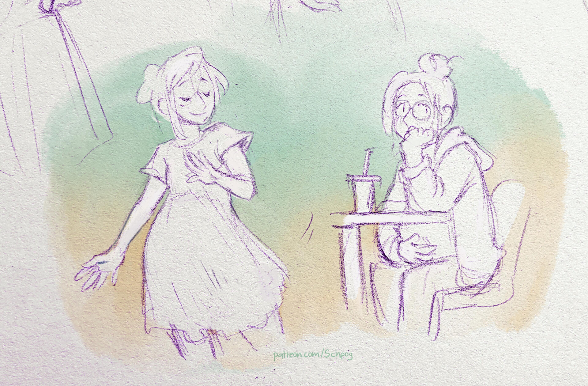 In “PWYW” (pay what you want) sketch commissions, everyone is allowed to throw in multiple requests, and I sketch those I feel like I can do well or quickly. If I did yours and you like it, you can donate whatever feels good to you (at least 5€ though). You can also donate even if it’s not your request. When I notice a sketch gets many donations, I will work a little more on it. Everyone who donates gets all the requests & warm up sketches from the current stream sent to via email before they will be posted!