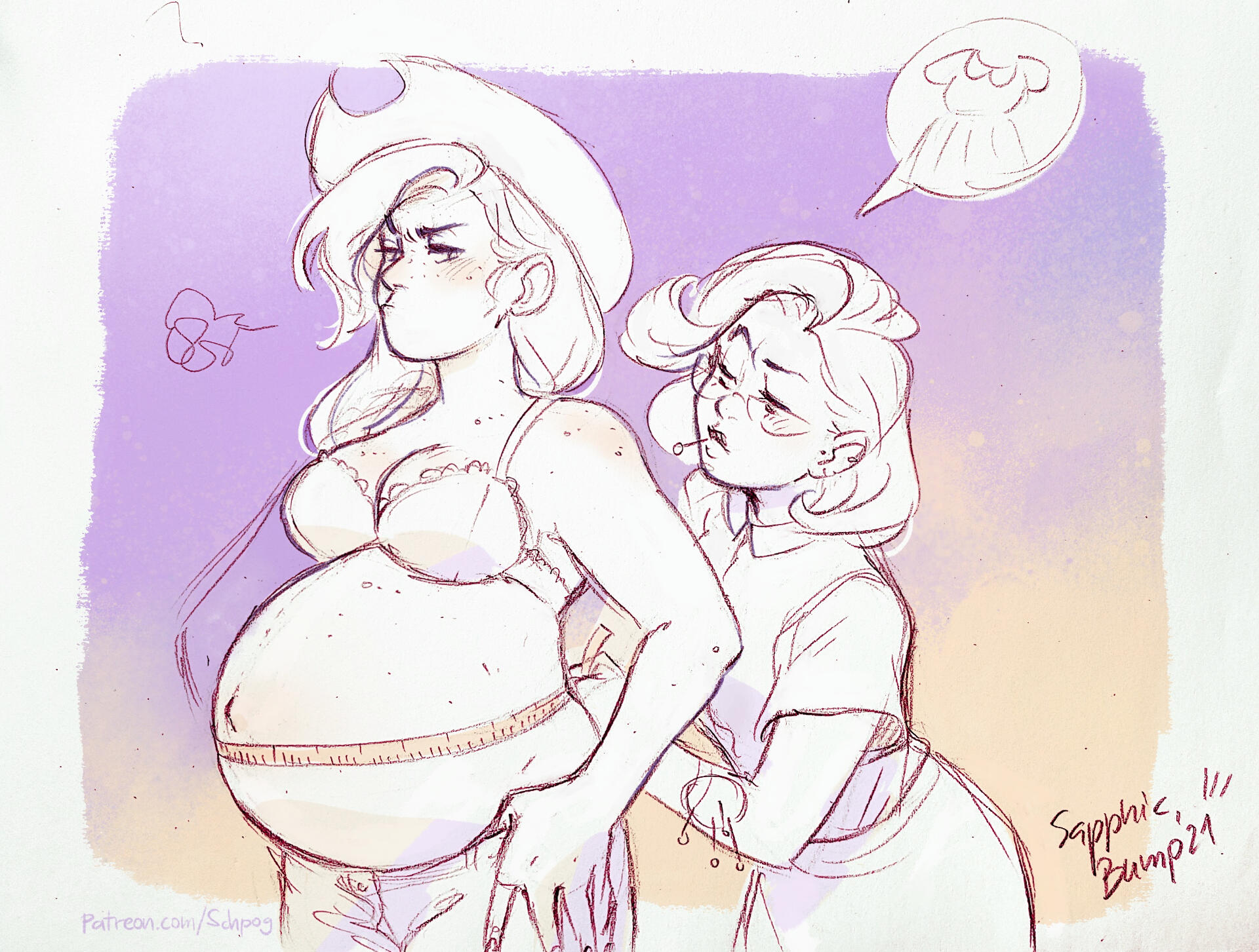 Shows a simple progression from the same perspective, but with different belly sizes & clothing behavior, in the AS style.